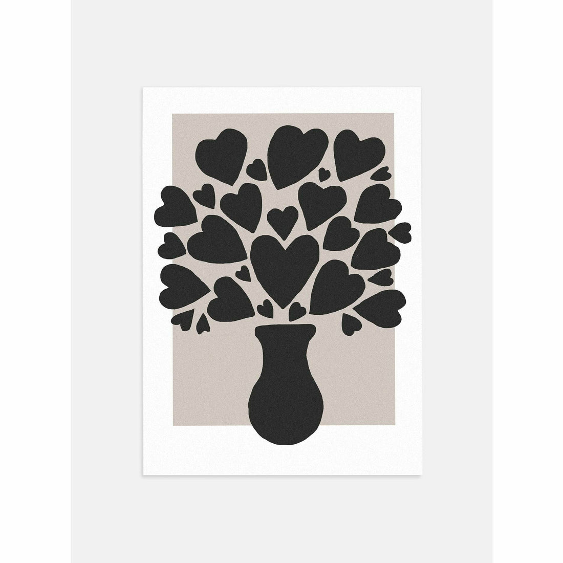 This minimalist digital poster features heart-shaped flowers in a vase, illustrated in bold black lines...