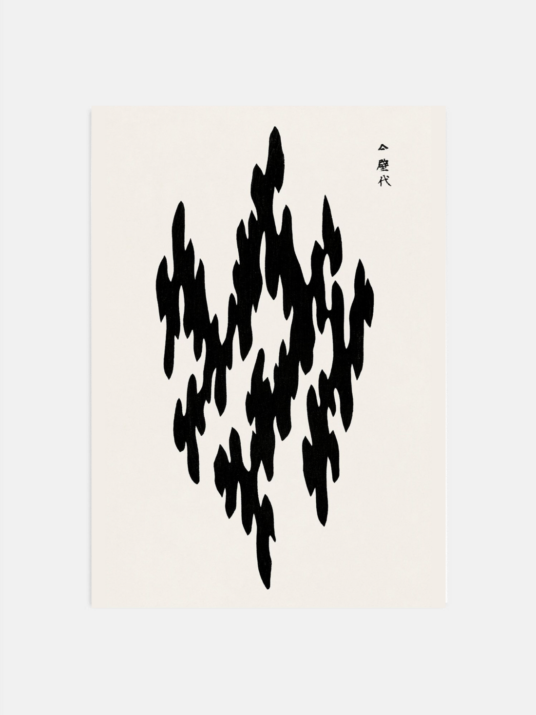 Beige background with black motifs and Japanese characters, in an abstract woodblock style by Taguchi...
