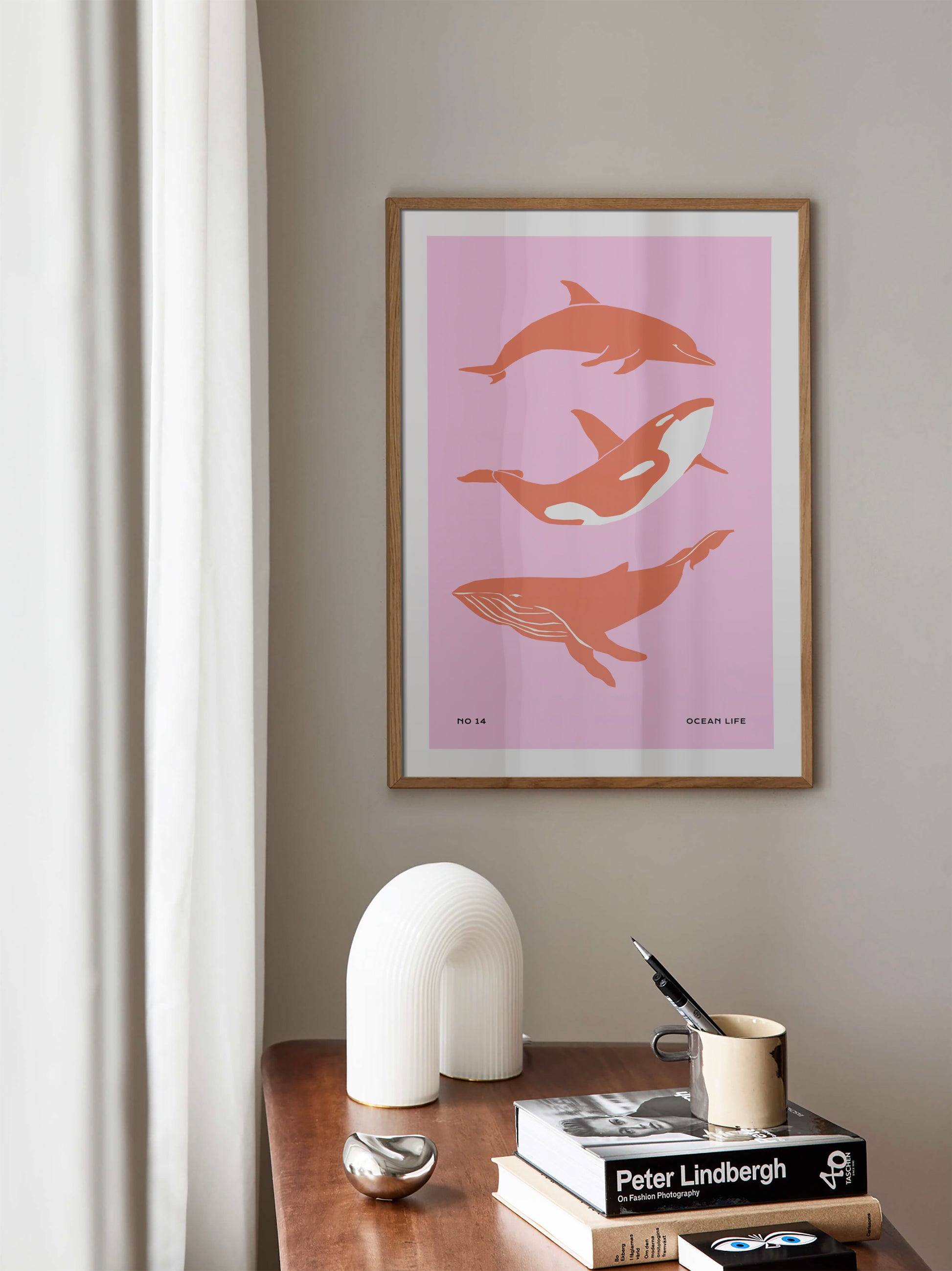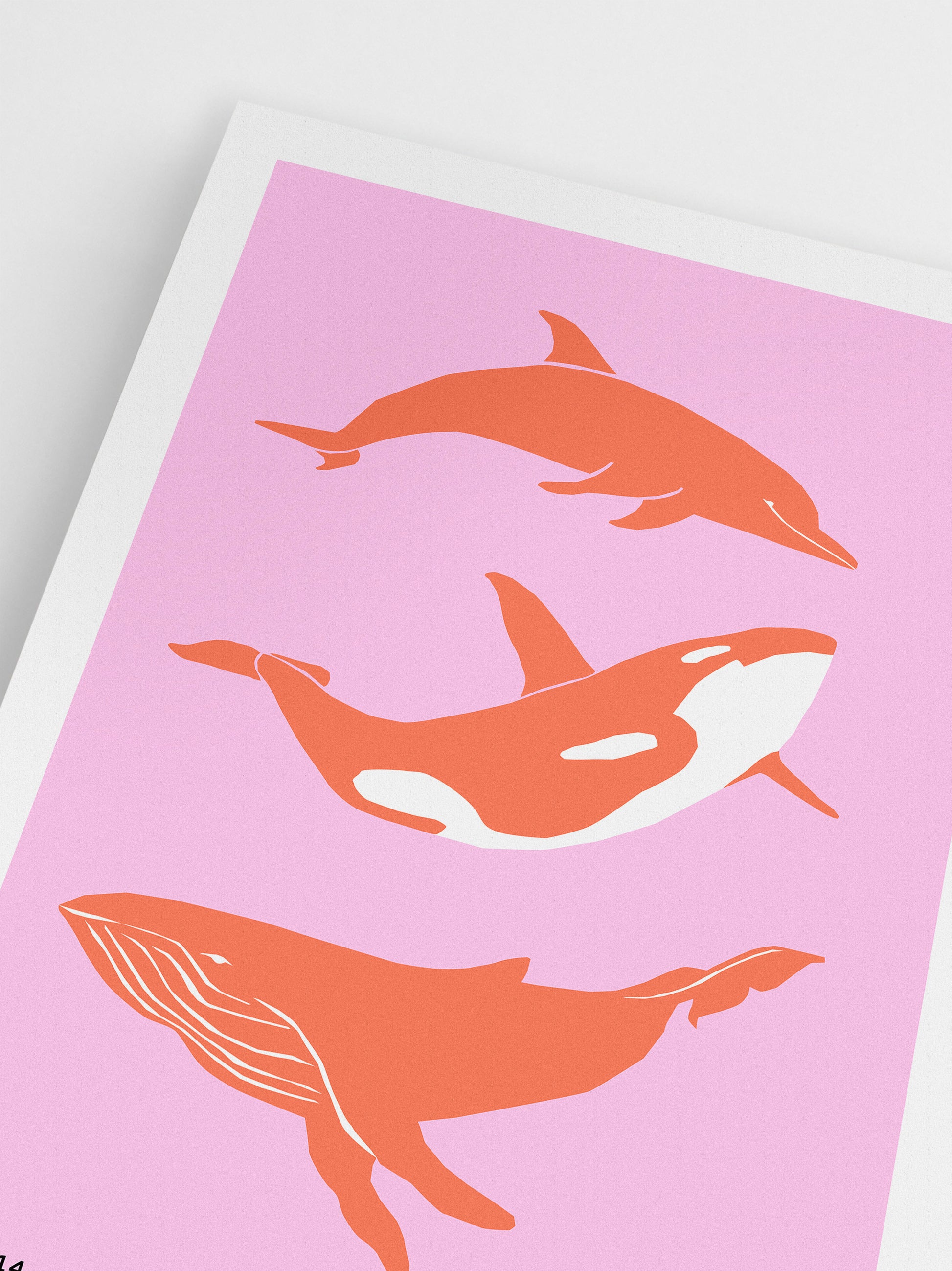 A fresh and modern take on room wall decor, this drawing of different whales is bright and modern, perfect to complement any space.