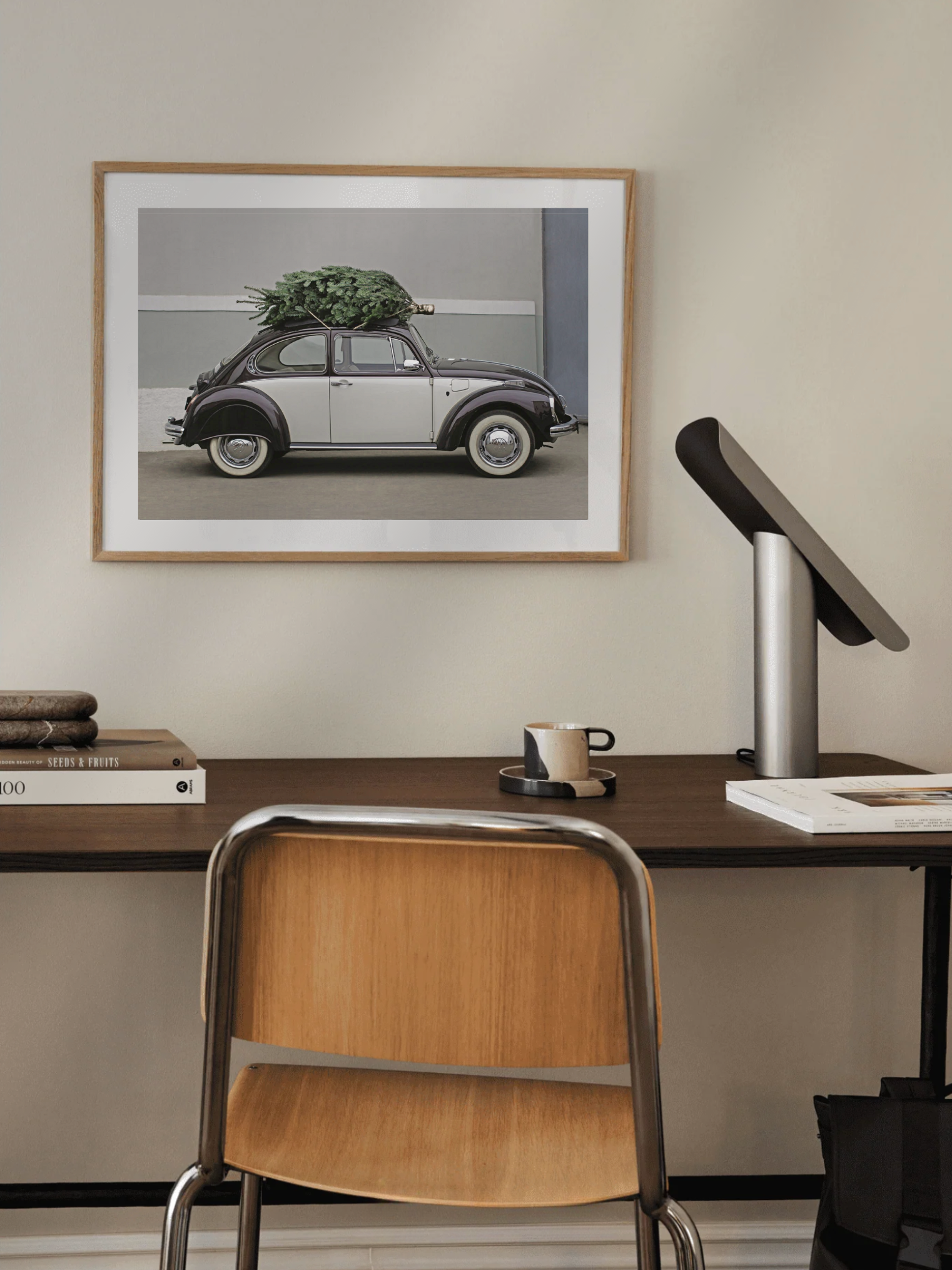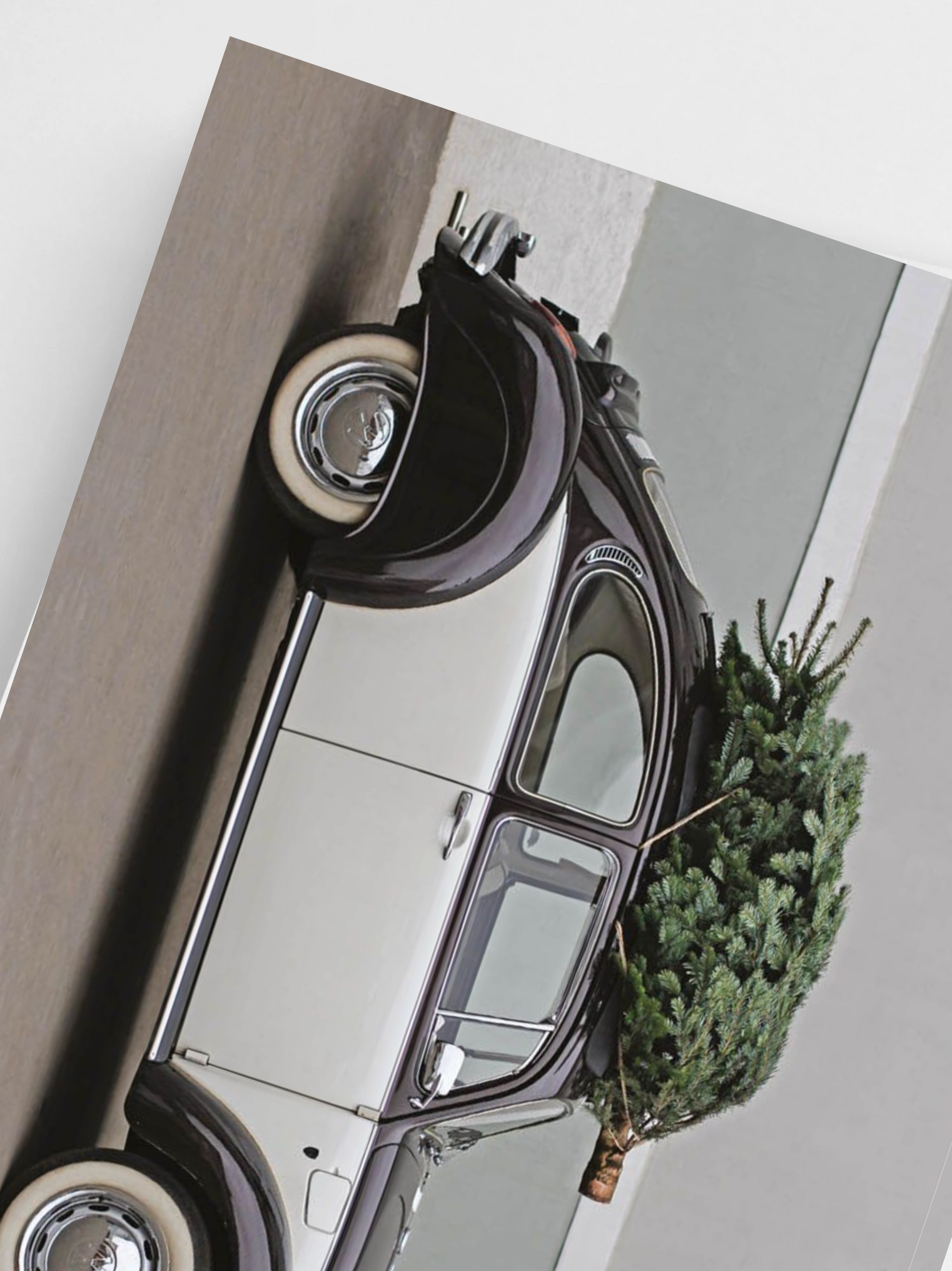 VW Beetle carrying a Christmas tree, captured in monochrome — festive nostalgia, boundless joy.