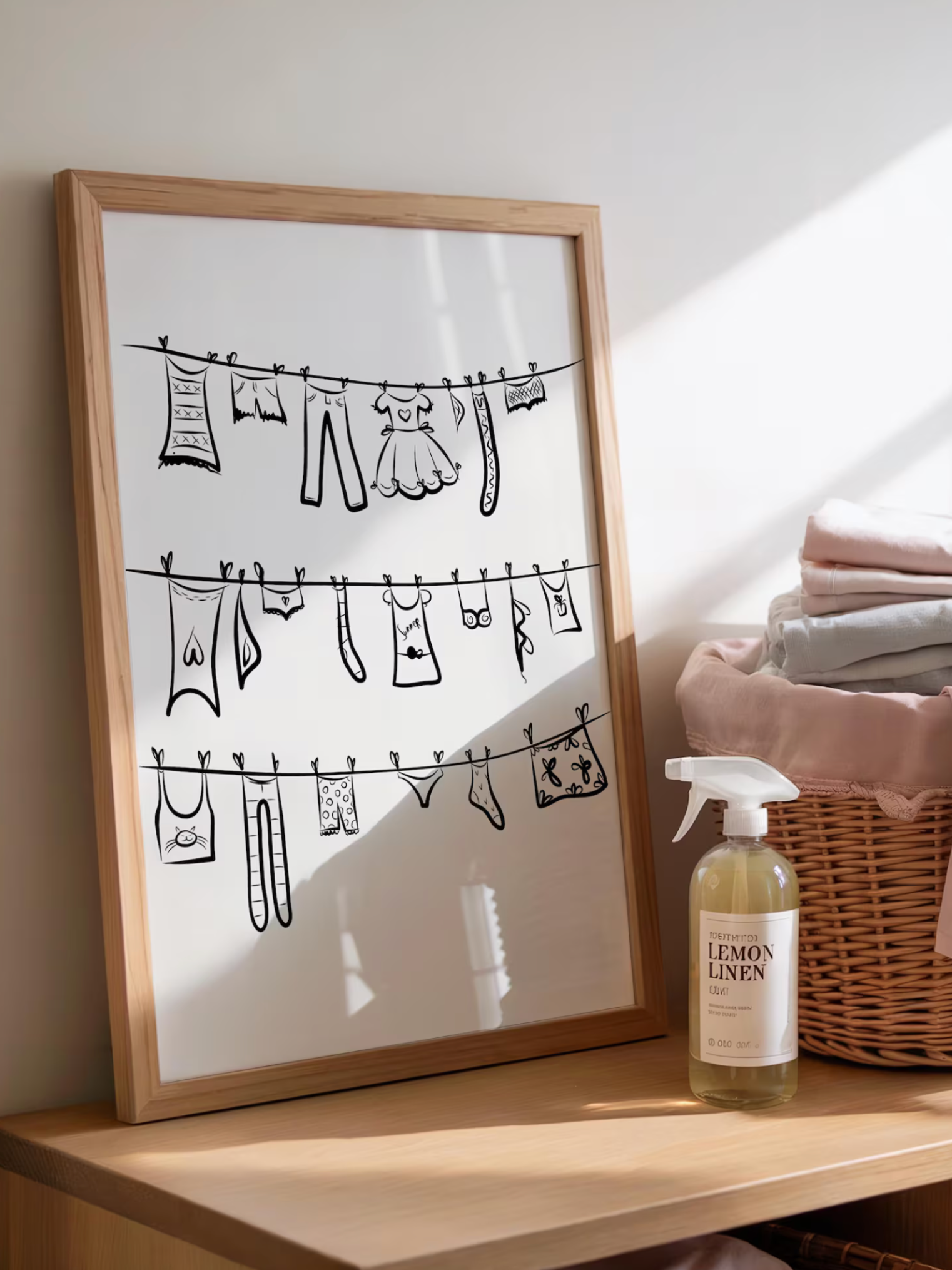Bring calm, modern charm to your laundry space with this minimalist laundry room wall art. Featuring a clean line art drawing of a clothesline, this digital poster blends perfectly into modern, Scandinavian, or farmhouse-style homes. Designed as a printable download, it's perfect for instant use—no waiting, no shipping. Whether you're decorating a washroom, utility room, or laundry nook, this art print adds a touch of simplicity and elegance.