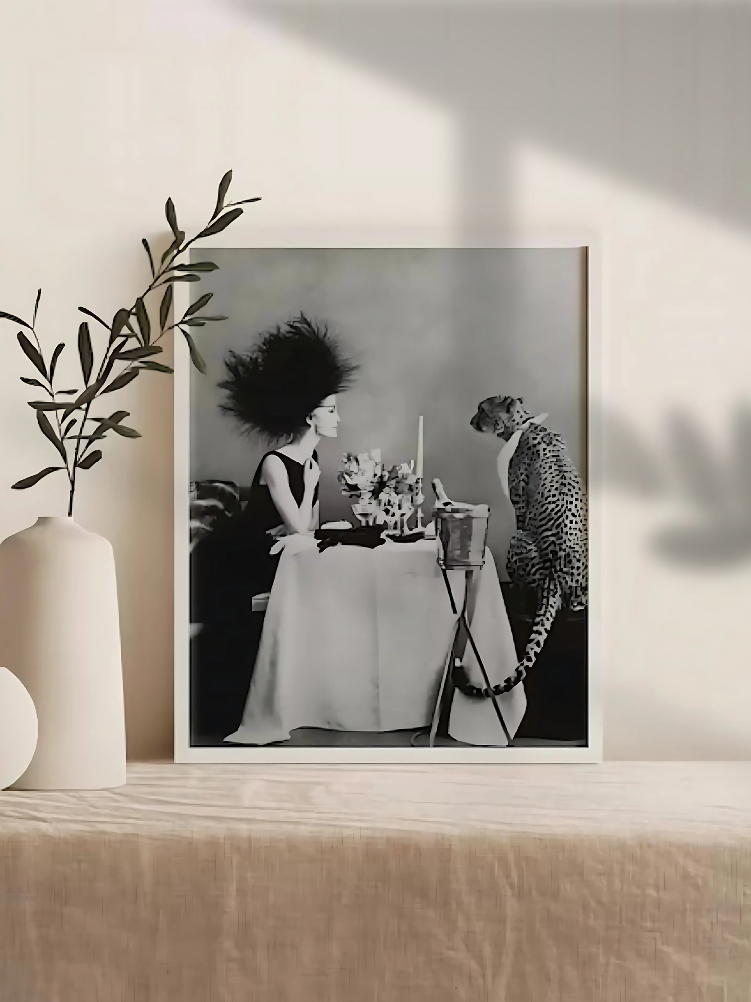 This striking black and white vintage print features a glamorous fashion model having dinner with a cheetah — a bold, iconic moment captured in timeless style. Perfect for fashion lovers, editorial wall art collectors, or anyone looking to add drama and elegance to their space. A high-quality digital download that blends luxury, vintage photography, and wild beauty.