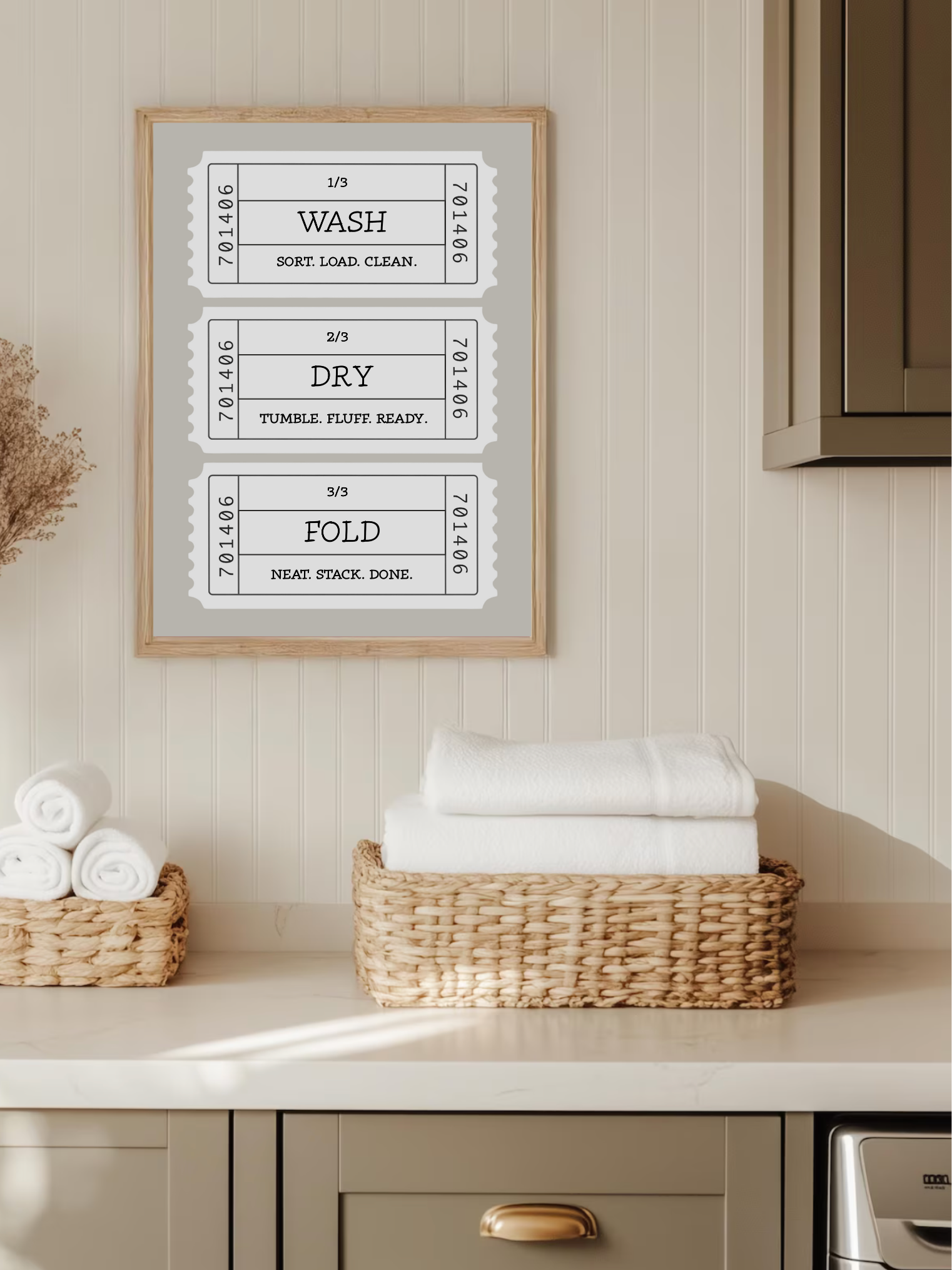 Style your laundry room with this ticket-inspired “WASH-DRY-FOLD” poster. Featuring a soft beige background, this modern print adds a cozy, minimalist touch that’s perfect for elevating your laundry space.